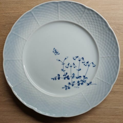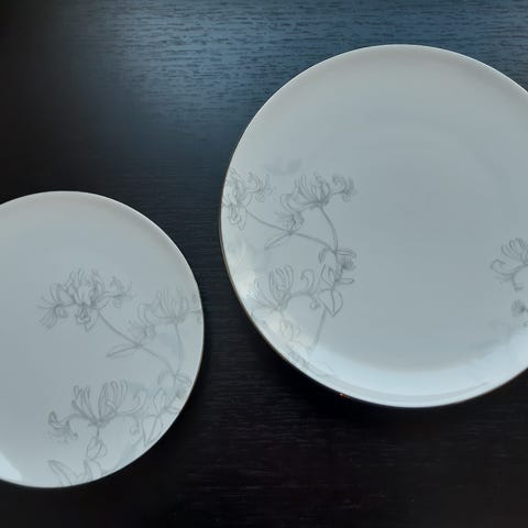 Käyttämättömät 8 kpl ruoka-astiat Carl von Linnea kirjaimilla: Halkaisijat iso lautanen 26 cm, syvä lautanen 23 cm, leipälautanen 21 cm ja 2 kpl tarjoilukulhoa halkaisija 21 cm ja 2 kpl kolmiosaisia tarjoilulautasia Nouto paikanpäältä