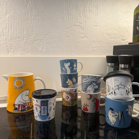 Uuden veroiset Arabian Muumi kannu ja keksipurkki. Kaupan päälle saman sarjan muki jossa pieni kolhu korvan vieressä.