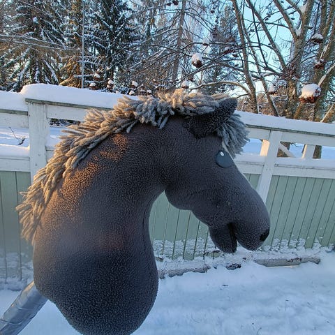 Myydään keppihevonen tumman harmaa. Kuvissa näkyvät varusteet sisältyvät kauppaan. Keppi ei sisälly. Lähetetään postissa.