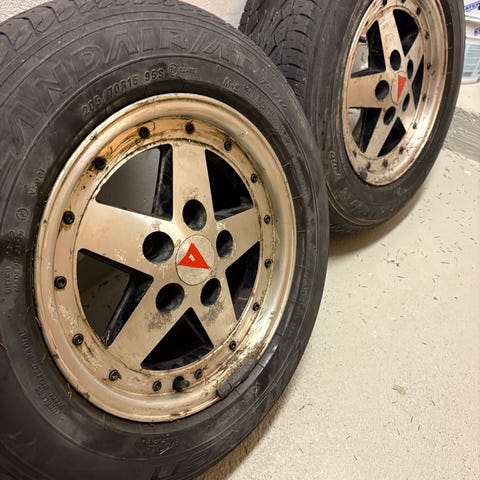 Ehjät mutta kiillotusta vaativat pontiacin vanteet, keskikupit löytyy mukaan. Oli tarkoitus laittaa E36 BMW alle, mutta suunnitelmat muuttuu.