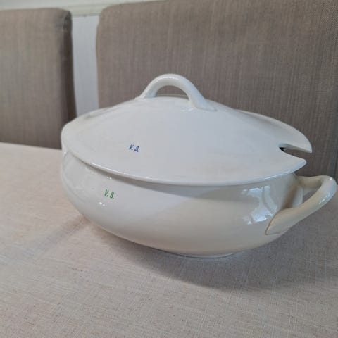 Muuten hyväkuntoinen kulho, mutta kannen alavallissa on lohkeama, esine on 1930 luvulta/piippuleima.