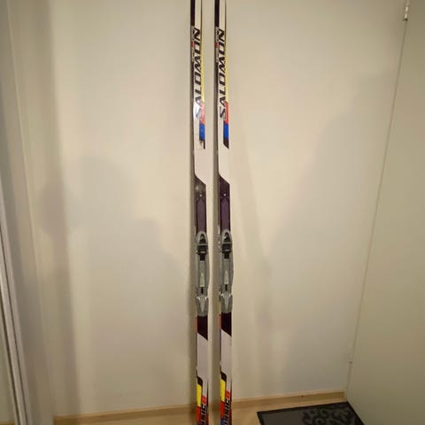 Hyväkuntoiset, vähälle käytölle jääneet Salomonin 196-senttiset perinteiseen hiihtoon sopivat sukset SNS Profil-siteellä.