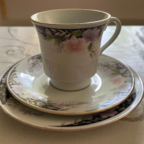 Myydään hyväkuntoinen harmaa vaaleanpunainen ruusukuvioitu kahviastiasto. Made in China.