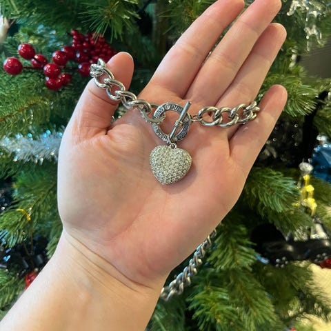 Aito Guessin sydän kaulakoru. Mukana on kuitti ja suojapussi, ostettu Stockmannilta. Jonkin verran käytetty, mikä näkyy toisella puolella korua sydämessä (kts. kuva).
