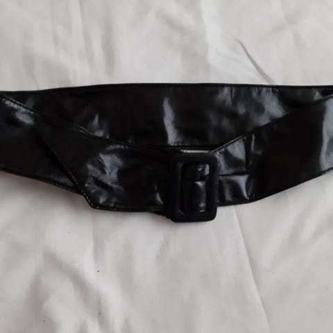 Musta patellavyö kiiltonahkajäljitelmä päillä. Vähän käytön jälkiä kiinnityksen kohdalla.