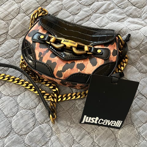 Roberto Cavalli, Freedom, uusi olkalaukku, kangasta ja nahkaa, eläinkuvioinen, sisusta pantteri- kuviota ja sisällä vetoketjutasku ja toinen pienempi tasku. Olkahihnan pituus noin 70 cm. Laukun koko korkeus noin 22 cm, pituus noin 42 cm. Ostettu Pariisista.