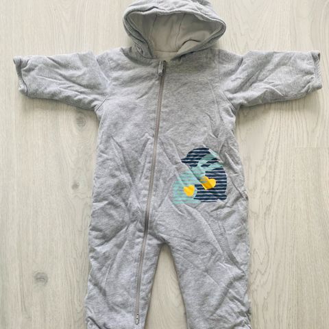 Vanuhaalari koossa 68-74 cm, väri vaaleanharmaa. Haalarissa on vetoketju kumpaankin suuntaan, suojakäännökset hihoissa ja lahkeissa sekä huppu. Haalari on ehjä ja siistissä kunnossa. Eläimetön ja savuton kotitalous.