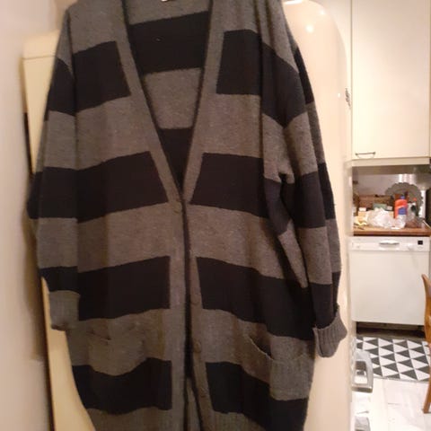 Näyttävä villatakki, jossa kultalankakoristeita, hienoisen pussitettu hihat ja upeita neulottuja kuvioita etu- ja selkäpuolella. Ylhäällä kaksi kiinnitysnappia.