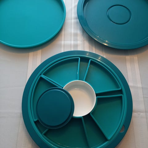Tupperware tarjoiluastia. Väliosan saa kanneksi. Pohjalautanen ja välilautanen kummatkin saa erillään tarjoiluastioiksi. Keskellä pyöreä irroitettava astia jossa valkoinen kansi. Kolme kolmiomaista astyiaa ovat irroitettavia. Erinomainen mm.lastenkutsujen tarjoiluun, tortillojen syöntitäytteiden salaatin ja kastikkeiden lokeroimiseen, välilautanen sopii "tortilla letuille". Kekseille, pähkinöille, marjoille. Raikas sininen ja vaaleamman sininen sopii moneen kattaukseen esim. exlusive sarjan kirkkaiden asioiden kanssa.