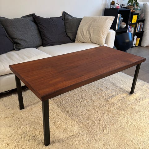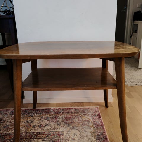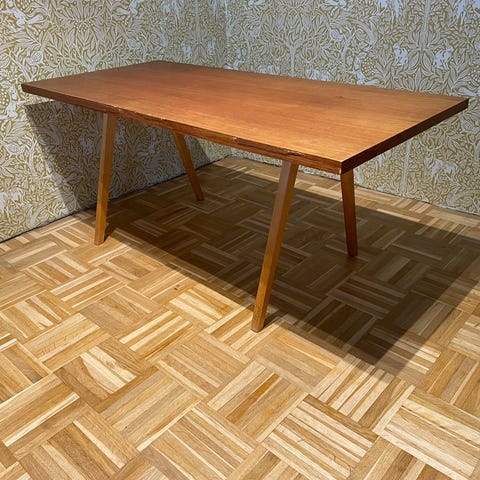Tanskalainen surfboard-tyypinen pöytä. 50-60-luku. Paksua tiikkiä, vaahterasydän, tammijalat.