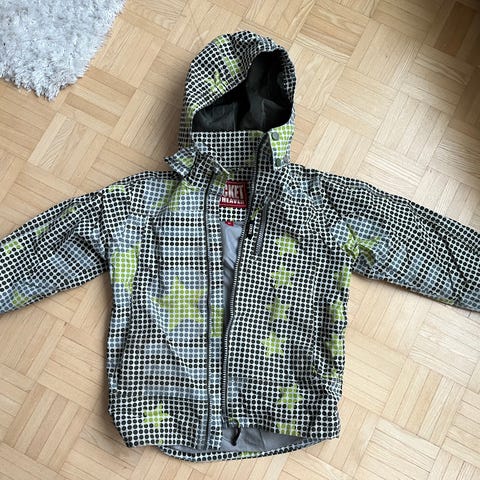 Vähällä käytöllä ollut veden- ja tuulenpitävä, ehjä ja siisti kuoritakki välikauteen. Valkoisia tähtiä sinisellä pohjalla.