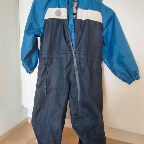 Vaaleansinivalkoinen tuulenpitävä kuoripuku. Hihoissa, polvissa ja takamuksessa vähän tummentumaa. Ei kulumia. Kuminauhat lahkeissa. Vähällä käytöllä ollut.