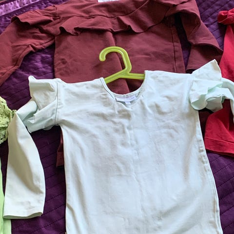 Kolme Gugguu paitaa koossa 134. Yhden tytön jäljiltä, mutta en kyllä nopealla kuntotarkastuksella mitään huomannut, tosin kuositkin ovat sellaisia, että pienet jäljet/tahrat kyllä katoavat sinne sekaan, vaikka sellaisia olisikin.