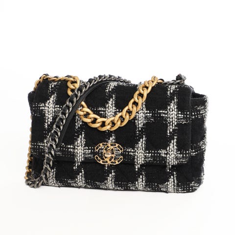 Hienostuneen laukun läpässä on Chanel CC -koristelu ja nahkakierteinen vanhentunut kulta-, hopea- ja ruteeniketjuinen olkahihna olkapehmusteella.