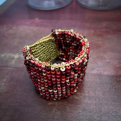 Kaunis, pinkki 3-kerrosrannerengas. Tehty metallilankaan pujotetuista pillihelmistä ja isommista kirkkaista ja pinkeistä helmistä. Halkaisija 6,3, joustaa. Ehjä. Postitus tai nouto.