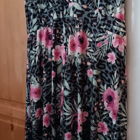 Valekietaisu mekko, rypytykset sivussa ja olkapäällä, yläosa ja helma edestä kaksinkertainen. Rintalaskokset, lyhyet hihat. Koko 54/56, kai- kai 62 cm pituus 105 cm.