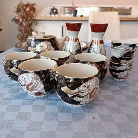Kuvan japanilainen teekuppi 6 kpl ja tassi 6 kpl. Yksi kuppipareista on kuvioltaan erilainen kuin muut (näkyy kuvassa). Kaikissa aiheena geisha. Ohutta posliinia. Kupin halkaisija n. 9 cm. Tassin halkaisija n. 13 cm. Jonkun verran käytöstä tullutta kulumaa. Ainoastaan nouto.