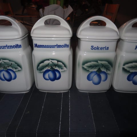 Pieniä maustepurkkeja 12 kpl virheettömiä h. 40€ kpl krakelituneita pieniä 4 kpl h. 20 € kpl sekä isoja 10 kpl h. 40€ kpl , salkkarit 30 ja 50€/yht. tarj.