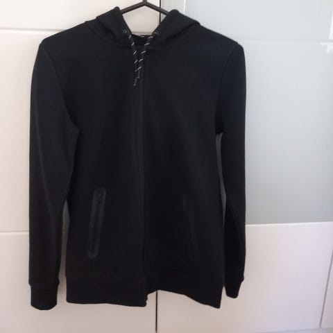 Musta hupullinen villatakki, vetoketju, edessä taskut. Koko s