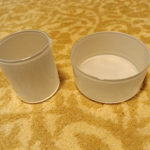 Iittalan valmistamat ja Timo Sarpanevan suunnittelemat sokerikko ja kermakko opaalilasista (2-kerroslasi). Sokerikon mitat: korkeus 3,5 cm, halkaisija 7,5 cm. Kermakon mitat: korkeus 5,5 cm, halkaisija 5 cm.