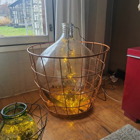 Myydään lasipullo ja rautakehikko lasipullon suussa pientä pari palaa pois