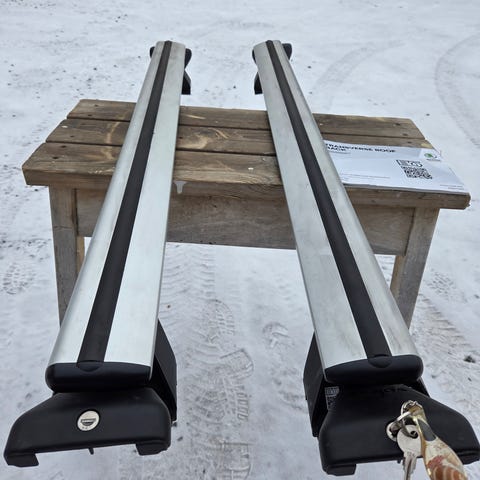 Škoda kattotelineet, joissa alumiiniset poikkiputket ja muoviset jalkasarjat. Telineet kiinnittyvät auton kattoon kiinteisiin kierreholkkeihin. Sopivat esimerkiksi suksiboksin tai muiden kattovarusteiden kuljettamiseen. Väri musta/jalaksissa metallinharmaa alumiini.
