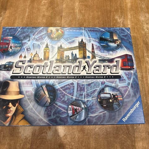 Myydään kuvan siisti ja ryhdikäs, vanha Ravensburgerin Scotland Yard-lautapeli. Osat kaikki tallella, mutta yksi pelinappula on korvattu uudella.