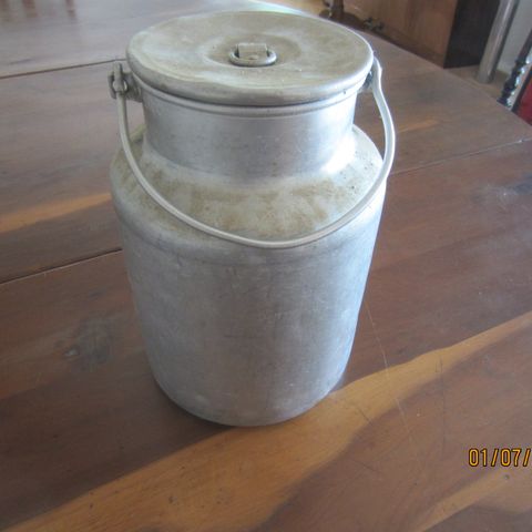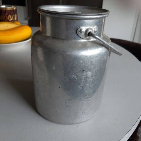 Emalinen muovikannellinen vaalea maitokannu; korkeus 18 cm + kansi, leveys pohjasta 16 cm. Kannun sisus ihan ehjä mutta reunassa kolhuja. Hinta 12 euroa.