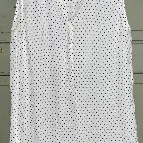 Myydään H&M valkoinen laskeutuvaa kangasta oleva juhlatoppi. Kauluksessa kullanvärinen metallinen koriste. Vaate on hyväkuntoinen. Koko 36.