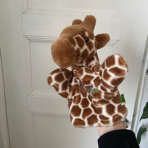 Kirahvi jonka kaulassa on pehmorenkaita.