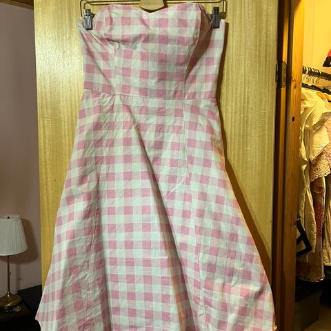 Nätti italialainen mekko. Kokolapussa lukee XL, mutta pidetty M-koossa. Hyväkuntoinen, kainaloiden saumat vähän alkaneet aueta, ei ole purkautunut. Vyötäröllä nauhat, jotka voi sitoa taakse.