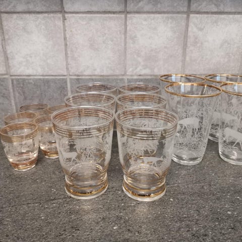 6 erilaista eläinaiheista pikaria sekä karahvi. Pysyvät pystyssä molemminpäin. Ilmeisesti italialaiset, 70-luvulta, hopeoidut?? Pikareiden korkeus noin 15cm. Metsästys.