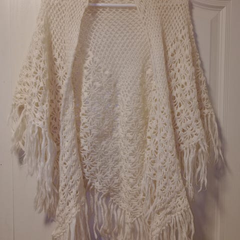 Hinta postitettuna 20 euroa. Käsityön taidonnäyte. Värit ruskea ja oranssi, langassa kimalteita, jotka eivät oikein erotu kuvassa. Isot hapsut reunoissa ja nauhat kaulan ympärille, ettei hartiahuivi tipahda. Korkeus 44 cm + hapsut, leveys 90 cm. käsityö