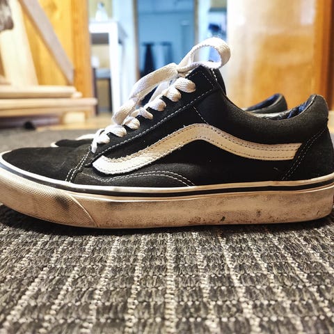 Oikean jalan kengän sisäpuolella kangas vähän rikki päällimmäisestä kankaasta. Pohjalla oleva musta kangas on ehjä