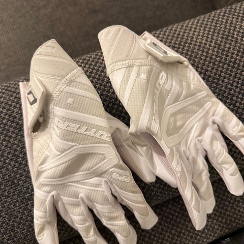 Kahdet erilaiset jefuhanskat, mustat ja punamustat eniten linjapelaajalle ajatellut. Molemmissa peukalosta sauma ratkennut mutta sen voi halutessaan korjata. Mustat hanskat s-kokoa ja integroitu kätevät rannesuojat joihin voi laittaa sisälle kovikepalan (kuvassa) jos haluaa - itse pelasin ilman. Punamustat ennemminkin miesten hanskat kokoa L/XL ja suojaavat hyvin käsiä. Hinnat ovat hyvin erilaiset (punamustat olivat yli 80 euroa uutena eli ovat hyvin laadukkaat repeämästä huolimatta).