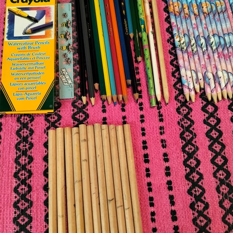 Tässä myydään värejä : värikynät, oil pastel "kynät", öljypastelli kynät,?, (en tiedä näköjään oikeaa nimitystä), sekä vesivärit. Vesivärejä jonkin verran käytetyt, pari värikynää näkyy puuttuvan, mutta kokonaisuus hyvä. Rasiassa kulumaa, mutta siinä nämä kuitenkin kätevimmin kulkevat. Hyväkuntoiseksi luokittelen tämän. / noutaen