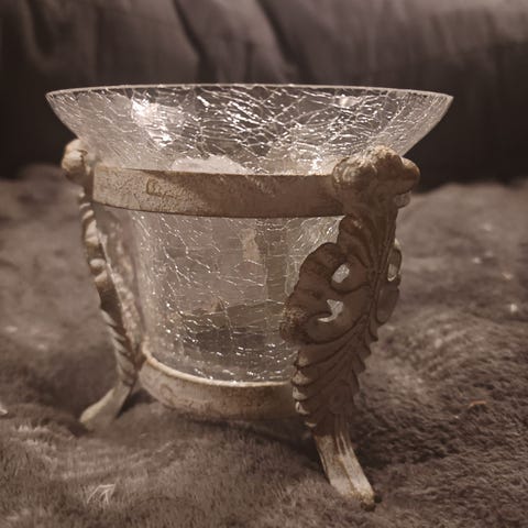 Sinivalkoinen kannellinen purkki, jossa koristeina kissankelloja. Korkeus n. 9 cm, halkaisija 10 cm. Ehjä vaikkakin vanhahko.