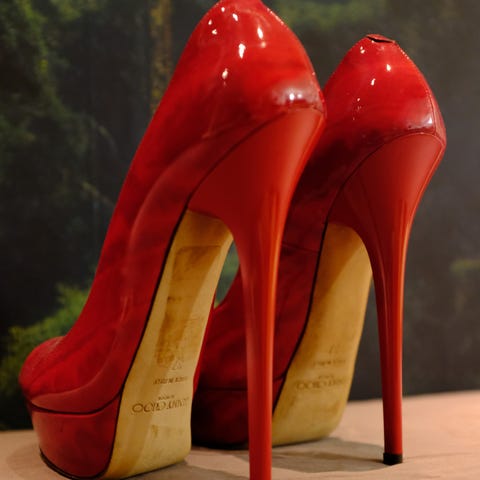 Käyttämättömät Jimmy Choo for H&M-korkokengät. Dustbag ja laatikko tulevat kenkien mukana.