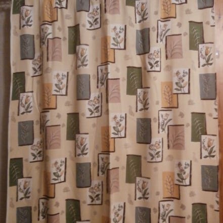 Kauniskuvioinen vanha vintage-verho, 1 kpl. Oranssia, vaaleaa oliivinvihreää, vaaleanruskeaa, ruskeaa. Kukka-aihe. Leveys 112 cm, pituus 128 cm. Yläreunassa ripustuskuja 5 cm. Alareunassa päärme 3 cm. Pehmeää kaunista kangasta. Puuvillasekoitetta. Ehjä ja siisti. Postitus tai nouto.