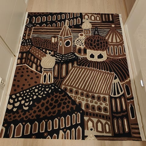 Värikäs iäkkäämpi kangas, jossa päädyt käännetty. Tämä sopii verhoksi tai seinälle ainakin. Mainio kuosi väreistä ja kanoista/ linnuista pitävälle. Myös kevään pääsiäistä juhlistamaan vaikka liinaksi. Harvemmin tarjolla. Reunateksti Oy 1976. Mmm