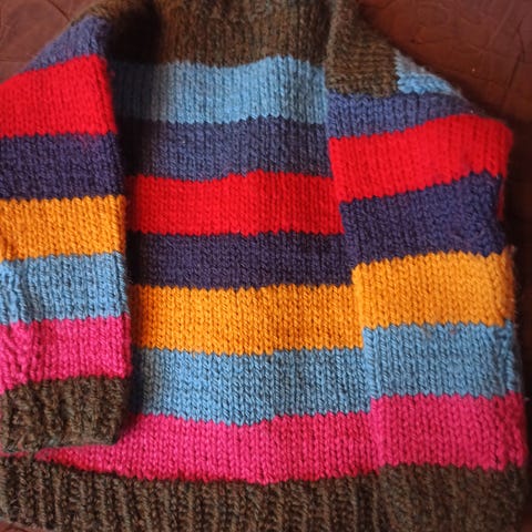 Lisäksi mukana yksi kaupasta ostettu villapaita, jossa korkea kaulus.