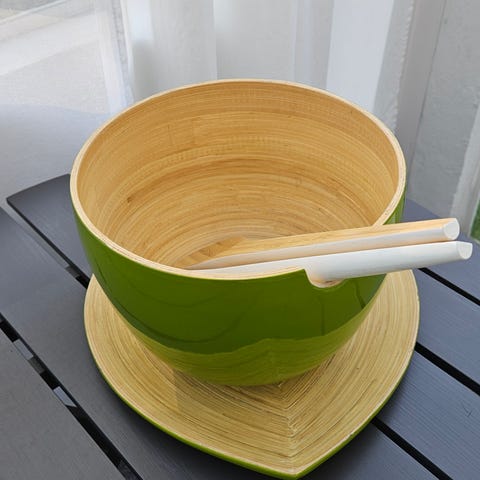 Ekobo, handmaid in Vietnam astiat. Kaksi kappaletta pieniä halk.23cm, kork.6cm vihreitä ja yksi iso halkaisija 45cm,kork.13cm valkoinen pohja. Pienet 4 € kpl, iso 10€. Itse käytin pieniä popcornin tarjoiluun, isossa säilytin mm. avaimia, latureita ym. eteisen pöydällä. Isossa takapuolella pari pientä kolhua. Koko setti 15