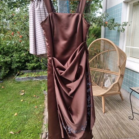 Famory mekko, mekossa koko 54, mutta todellinen 46-48, mekko ostettu morsiuspukuliilkeestä kaason mekoksi. Mekkoa käytetty kerran. Väri upea ruskea ja mukana hartia huivi