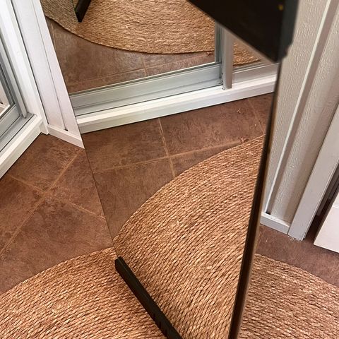 Ilmeisesti 70-luvulta. Peilin pinnassa on pieni jälki (kts. kuva). Peili kehyksineen on todella siisti, ja sen takana on rautalanka, jolla peili on mahdollista kiinnittää seinälle. Peilin mitat ovat 43 cm x 43 cm.