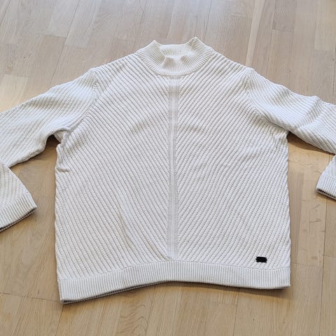 Valko-vaaleanharmaa-tummanharmaa,puuvillaa. Puseroa on pidetty mutta on siistikuntoinen. Pituus edestä keskeltä 66 cm, hartian ja helman leveys n. 50 cm, hihan pituus hartiasta alaspäin 68 cm, leveys ranteen kohdalla 11 cm