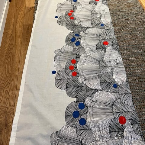 Marimekon kirkasvärinen Nalle kappaverho, noin 290cm*63cm. Erittäin hyvä kunto muuten, mutta verhonipsujen kohdalla reunassa muutama pieni, ilmeisesti nipsusta tullut jälki.