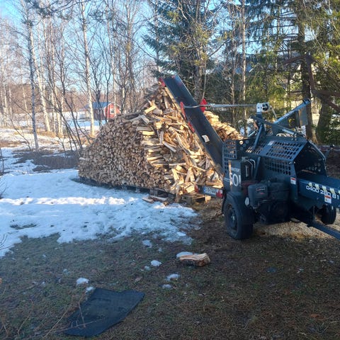 hydraulisella puunnostimella nostat isommatkin puut syöttöpyödälle säästäen selkääsi ja käsiäsi. Pitkä 3.7 metrin sivusuunnassa kääntyvä kuljetin mahdollistaa klapien teon konetta siirtämättä esimerkiksi kolmeen isoon säkkiin