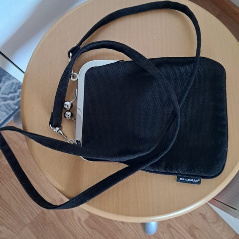 Myydään Marimekon musta olkalaukku. Laukku on vanhempaa mallia. Laukun läpässä on vetoketjulla suljettava tasku. Laukun etuosassa läpän alla on kaksi taskua.