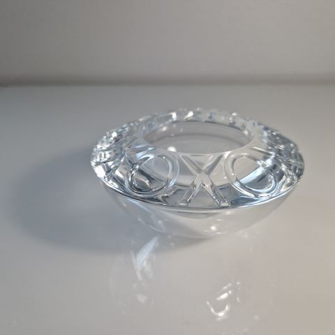 Riihimäen lasin tukeva lasinen kynttilänjalka. Korkeus 7 cm, halkaisija 14 cm.