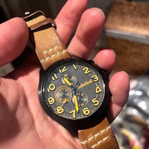 Myydään kerran pidetty 2 vuoden takuun omaava uusi miesten Timberland rannekello. Nahkaranneke, qvarts koneisto.